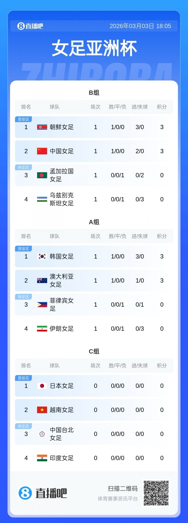 世界杯门票-女足亚洲杯积分榜:中国女足暂居第二,朝鲜女足净胜球优势居榜首